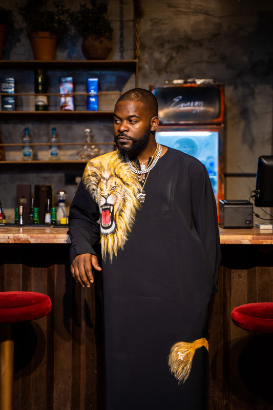 Embrace your inner power with this statement Jalabiya. Hand-painted with a striking yellow lion head...