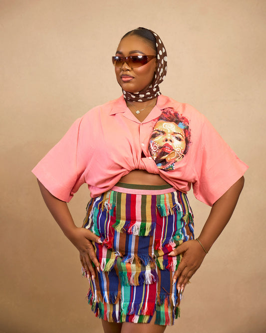 The Aso-Oke fringe patch skirt showcases exquisite handwoven fabric that elegantly reflects a rich cultural...