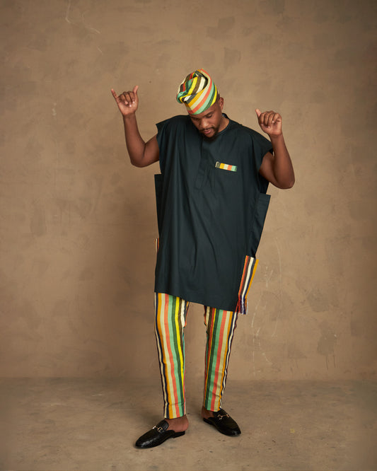 Mejora tu estilo con nuestro caftán pintado a mano y pantalón Aso Oke Una fusión...