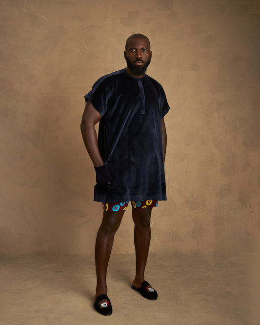 Conjunto de lino azul marino y pantalón corto Aso Oke