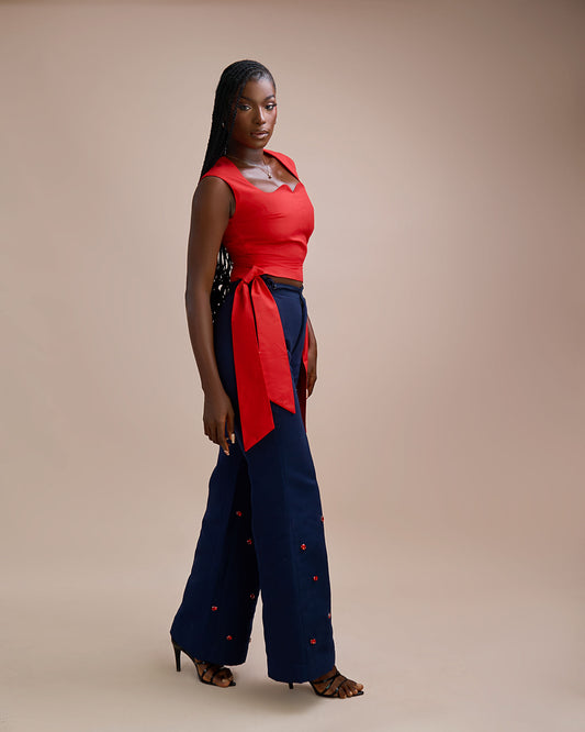 Top corto Queen Ann x pantalón Aso Oke de pierna ancha con detalle de cuentas