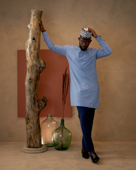 Caftán Agbada azul turquesa y pantalón Aso Oke