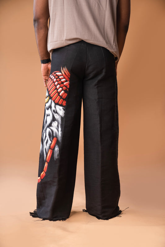 Pantalones de pierna ancha en mezcla de Aso Oke Ft Arte de león igbo pintado a mano