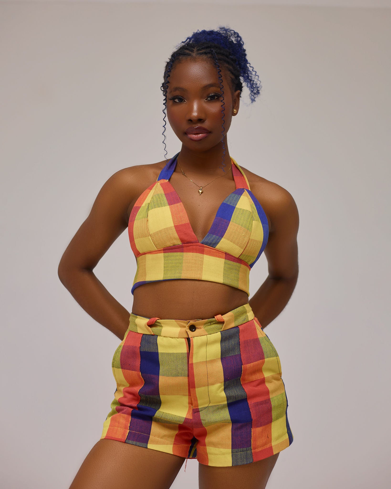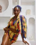This striking two-piece blends Aso Oke fabric with a daring, contemporary cut — a sleek bralette paired with perfectly tailored bum-shorts. The rich textures and vibrant patterns celebrate Nigerian tradition, while the sharp silhouette brings a modern, runway-ready edge.