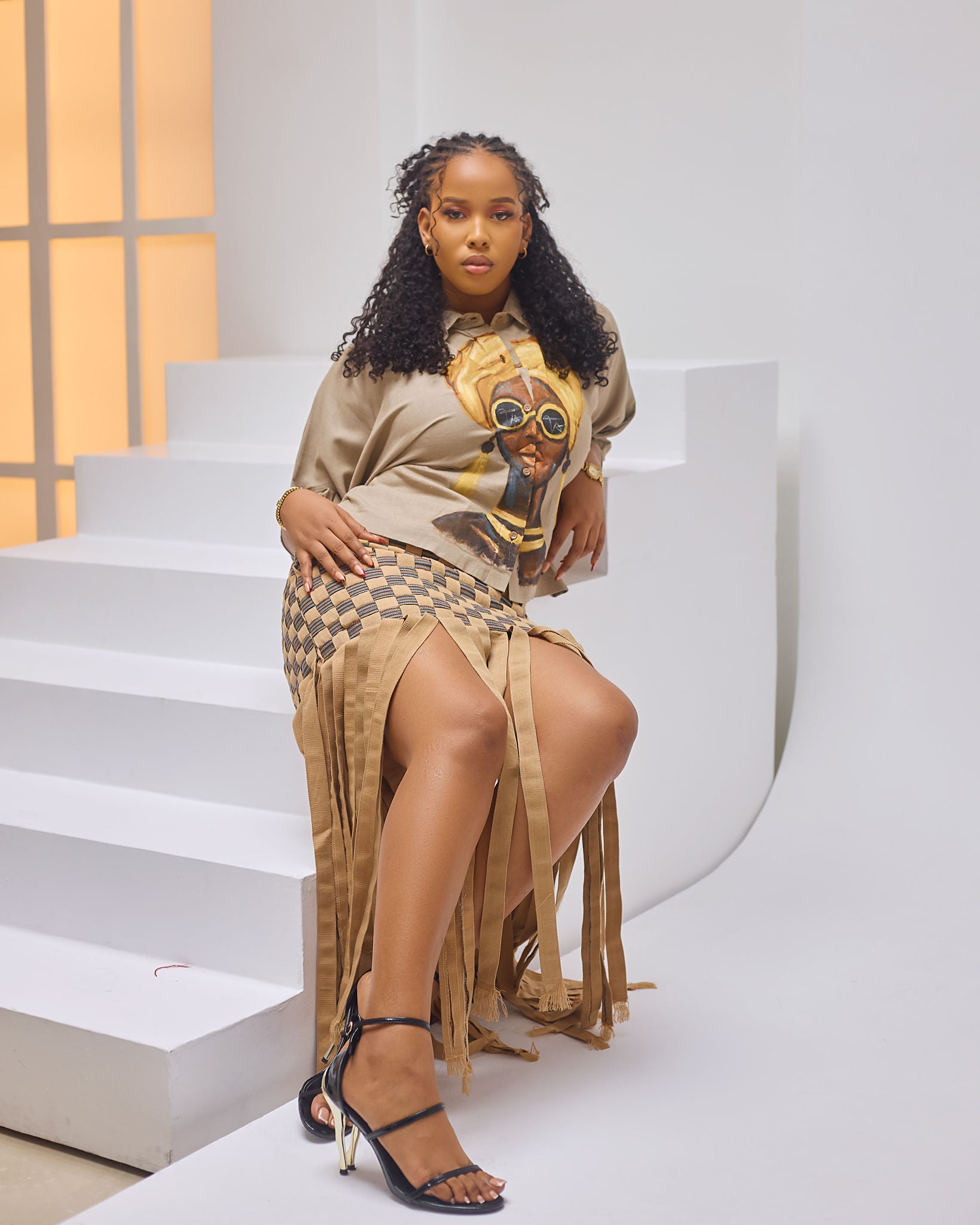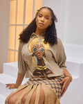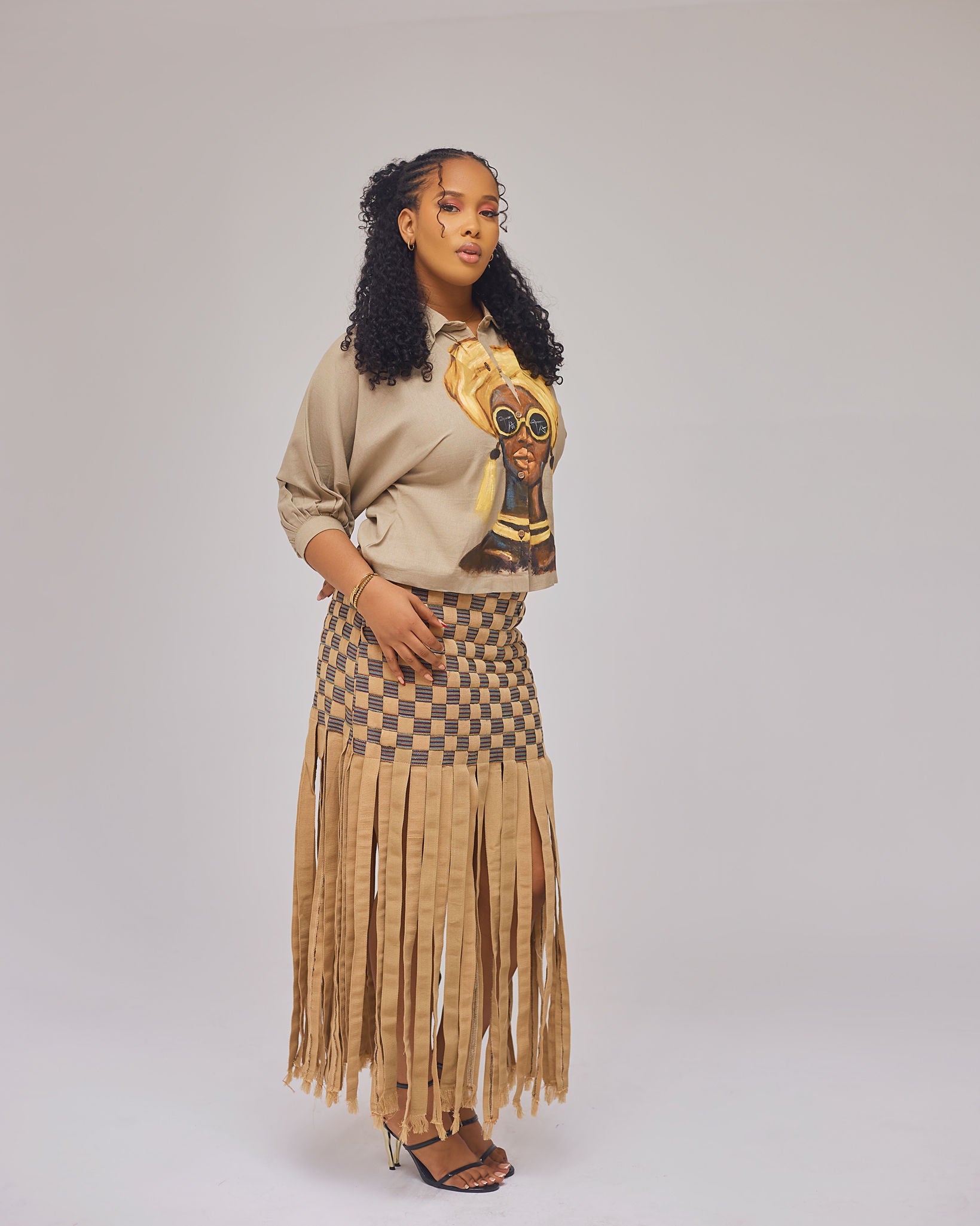 A look that speaks art and movement. This set pairs a handpainted crop shirt, each stroke uniquely crafted for one-of-a-kind expression, with the rich brown Baskirt, designed for effortless drape and bold silhouette. The result is a fusion of wearable art and contemporary street luxury — earthy, edgy, and unmistakably Trax. Perfect for making a statement that feels both rooted in culture and unapologetically modern.