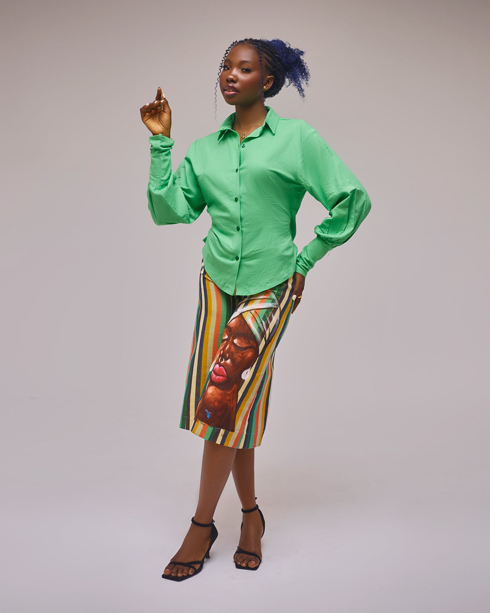 A bold interplay of minimalism and heritage. The crisp green Hemd top delivers clean lines and a modern, structured fit, while the handpainted Aso Oke pants bring texture, artistry, and a rich cultural narrative to the ensemble. Together, they create a look that balances effortless sophistication with vibrant individuality — perfect for making a statement where contemporary fashion meets timeless tradition.