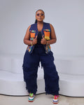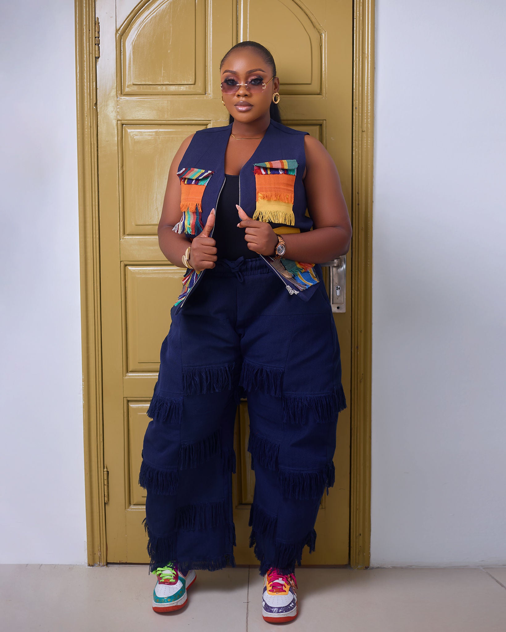 Culture meets motion in this standout ensemble. The sleeveless Aso Oke jacket delivers sharp tailoring and heritage texture, while the fringe pants bring fluid movement and playful edge with every step. Together, they create a look that is fearless, tactile, and rooted in Nigerian craftsmanship, balancing tradition with modern street-luxe energy. Perfect for turning everyday moments into a runway statement.